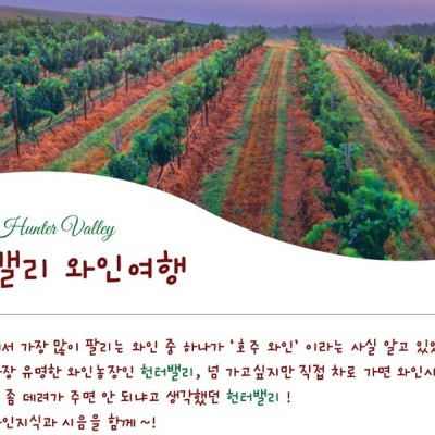 와인스쿨 출신, 16년경력에 빛나는 와인전문가와 함께하 는 헌터밸리 와이너리 투어입니다. 호주 와인 역사를 얘기할 때 빼놓을 수 없는 호주 와인의 최초 생산지 헌터밸리에서 지역 유명 와이너리들을 방문하여 드넓은 포도밭도 감상하고 시음을 즐기면서 취향에 맞는 와인을 찾아 볼 수 있습니다.